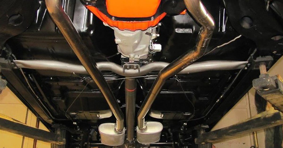 A look at the exhaust system featuring the 2-inch exhausts and dual reverse-flow mufflers, as well as the transmission. (Photo courtesy of Mecum Auctions.)