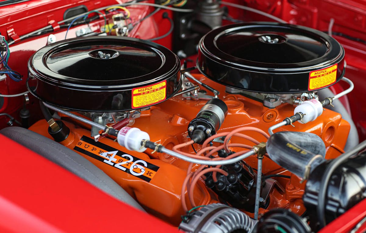 Featuring a 4.25-inch bore and a 3.75-inch stroke with a solid-lifter valvetrain, the Hemi touted a 10.25:1 compression ratio, down from the race version’s 12.5:1.
