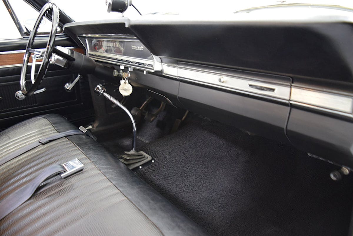 Under a lightweight, fiberglass lift-off hood with quad pins and a functional forward-facing scoop, the 427 OHV V8 had a cast-iron block, “medium-riser” intake (which afforded high-riser flow in a more compact package), Holley 9510-BC and 9510-BD 710-CFM four-barrel carburetors, mechanical pump, and an Autolite single-point mechanical-advance distributor with under-dash amplifier.