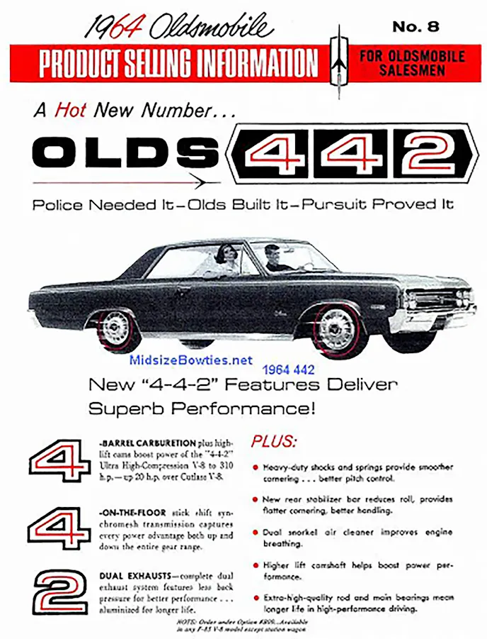 Developed by Olds engineers John Beltz, Bob Dorshimer, and Dale Smith, the 4-4-2, named for its four-barrel carb, four-speed manual, and dual exhausts, was internally known as the B09 Police Apprehender Pursuit package.