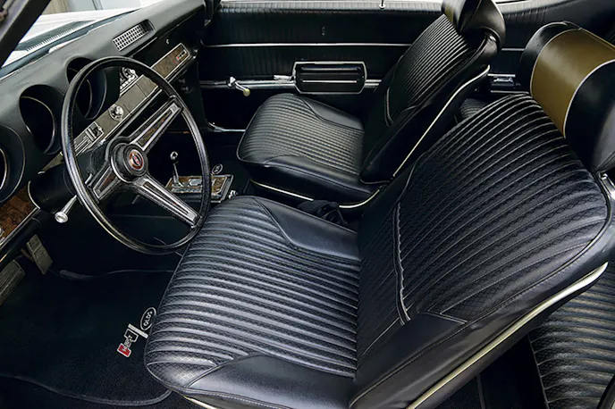 Inside the all-black interior were vinyl Strato bucket seats, a woodgrain three-spoke steering wheel, and the Rocket Rally-Pac cluster with a tachometer. A walnut insert and a “Hurst/Olds by Doc Watson” decal completed the dash.