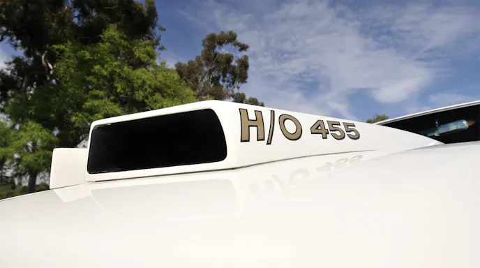 The silver and black paint combination of the previous year was dropped for a now-iconic scheme of Cameo White with Firefrost Gold accents consisting of hood, side, rocker panel, and decklid stripes. Matching, gold “H/O 455” callouts graced the hood scoops, and the grille was blacked out for a more aggressive look. Inside, a different wood veneer was fitted and painted gold stripes enhanced the headrests.
