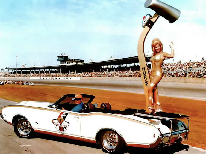The East Coast car made a memorable appearance at the 1969 Daytona 500, doing several slow circuits during breaks in the racing action. With George Hurst behind the wheel, Linda “Miss Hurst Golden Shifter” Vaughn waved to the fans while sharing a platform on the trunk with a nine-foot-tall Hurst Shifter replica.