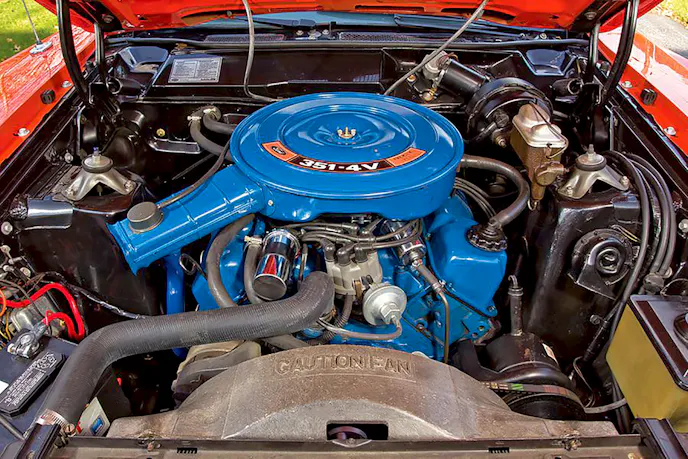 Under the hood, however, there were more significant modifications. The 289 was dumped in favor of the 302 as the standard engine, and the 351 Windsor V8 in two-barrel and four-barrel configurations became available. The Cobra Jet engine could be had with or without a Ram Air Package, which, when selected, made the hood scoop functional and mandated a 3.50:1 diff.