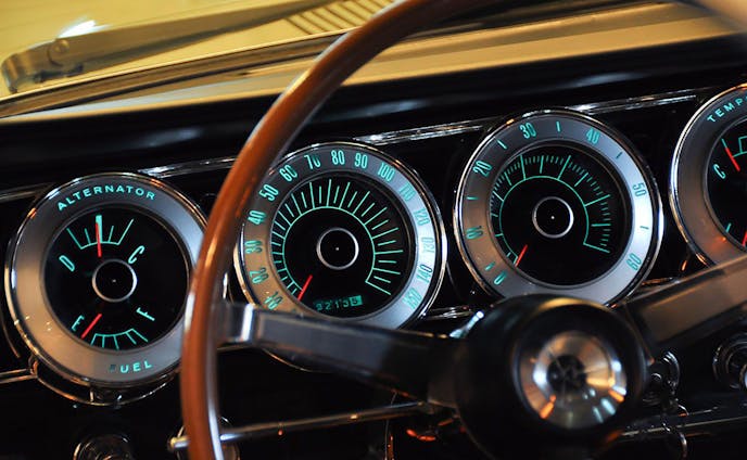 Inside were unusual bucket seating front and rear, a full-length floor console, and a complement of gauges housed in metallic-bezeled faces backlit by electroluminescence.