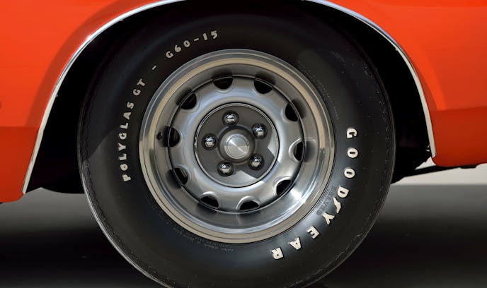 For slowing down, heavy-duty 11-inch by 2-1/2-inch drums resided in front, with 11-by-2-inch drums in the back. Power assist and front discs were included in the Super Track Pak. A variety of wheels, ranging from 14-inch steelies to 15 x 7-inch Rallye wheels shod in G60 performance tires were available.