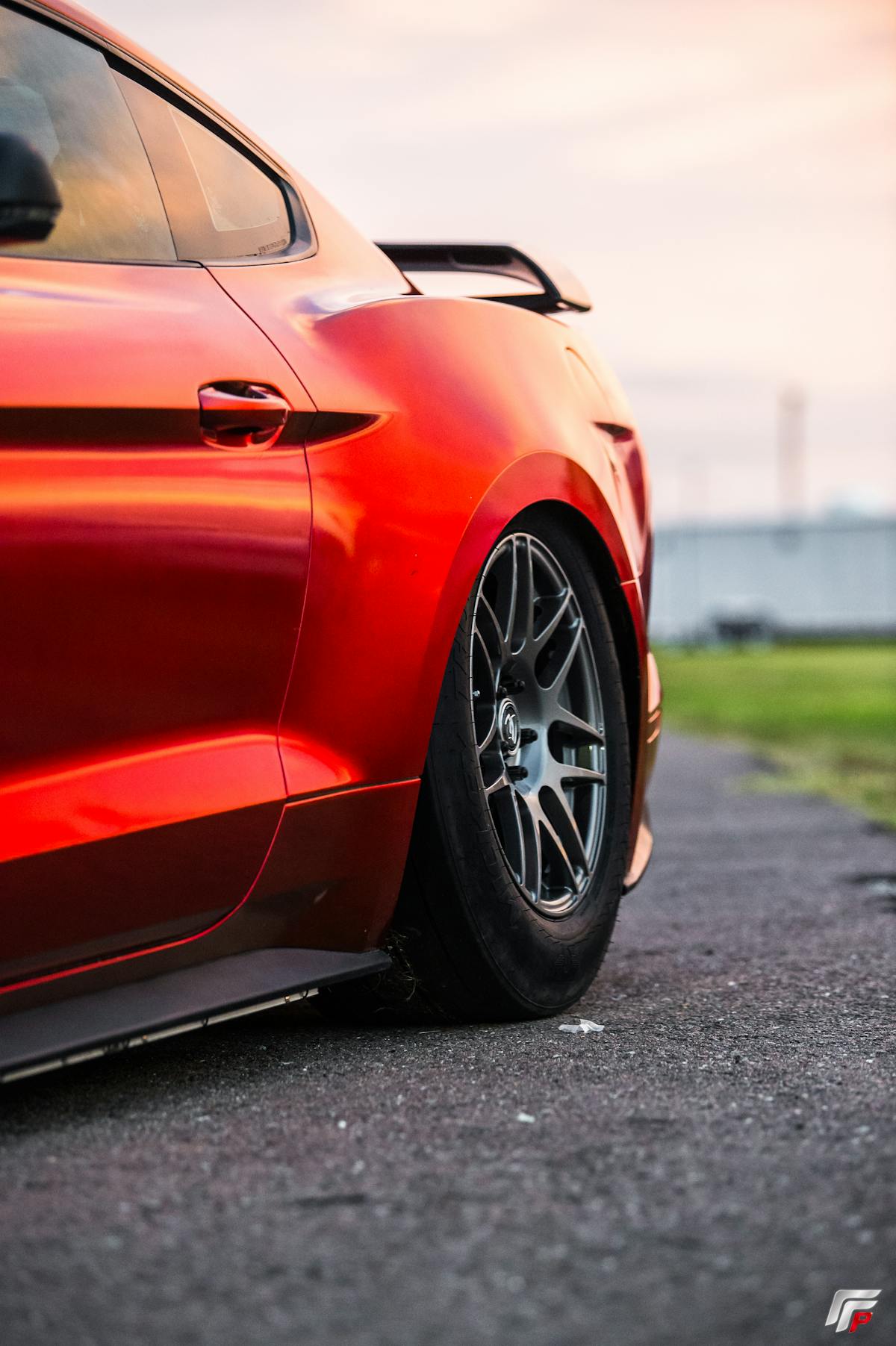 This Ecoboost is quite literally and figuratively on the ground thanks to a complete Airlift Performance Strut + Bag combo. In the trunk is Airlift Performance 3P management system + compressor tank. To keep this Mustang in motion, are a sponsored set of Vertini RF1.5 Wheels featuring a 5 split spoke design. 20×9 +32 up front and a 20×10.5 +45 in the rear. When in drag race mode, FF Performance has provided Jon a set of Forgestar F14 Drag Pack wheels measuring in at 17×10 +44 colored in Gunmetal. Mounted up to those Drag Packs are a very aggressive standing Mickey Thompson ET Street R Bias Tire, 28×11.50R17.