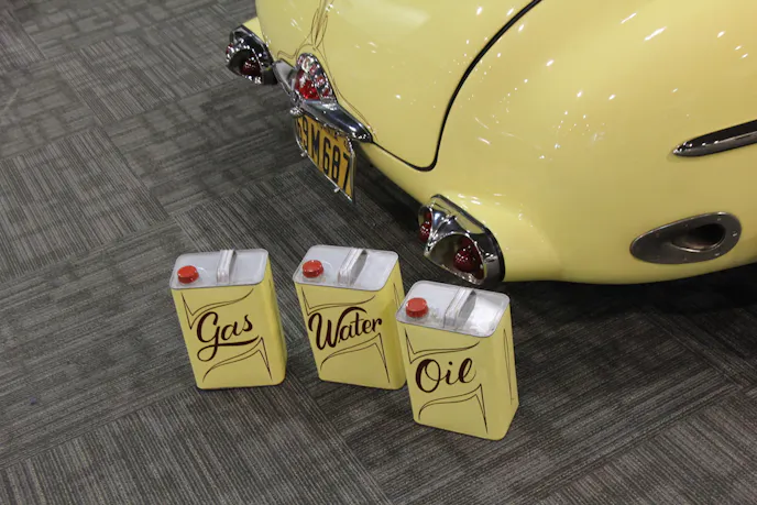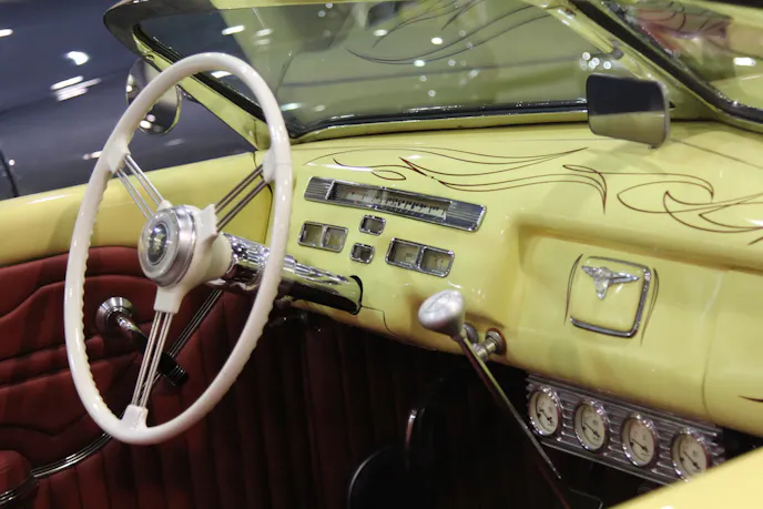 The seat is from a Buick but the interior and seat coverings came from Joel’s Upholstery in Riverside, California. The painting was performed by Dean himself, but the pinstriping was done by Jones Custom Lettering and Striping. The brightwork was done by Ultra Mega Chrome in Los Angeles.  Keith installed a small-block 350 cubic-inch Corvette engine and three-speed TH400 transmission.