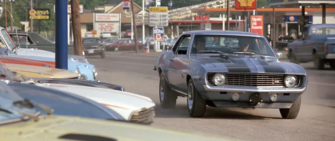The primary car in the film is Brad Sr.’s ride, a stunning 1969 Chevy Camaro Z/28 coupe. Seemingly flawless in Metallic Glacier Blue with twin matte black hood stripes, the car features a black vinyl interior, and a ZL2 cowl induction hood.