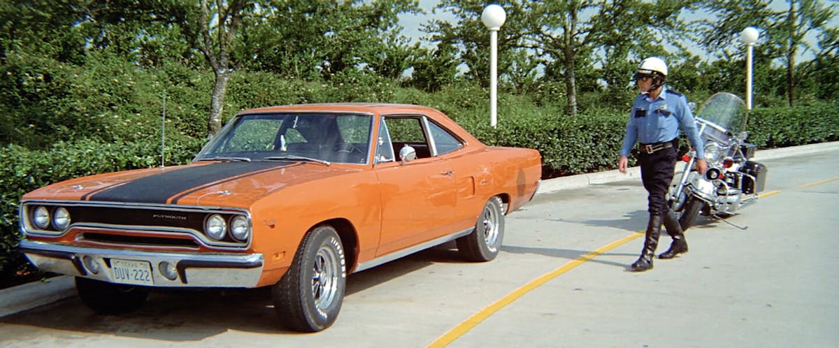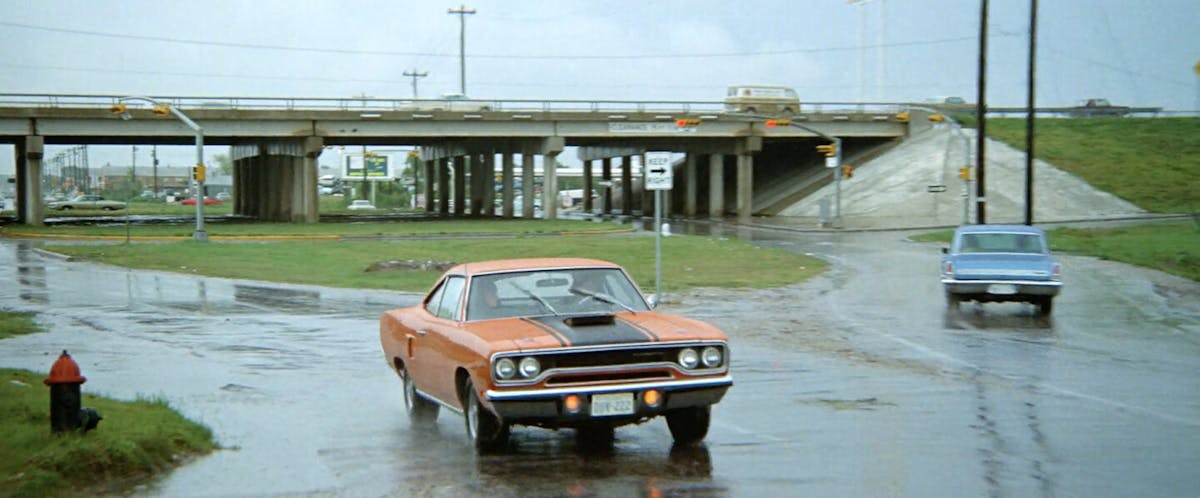 The Road Runner takes part in a spectacular, extended chase sequence during the third act of the film, which Altman no doubt intended to again spoof Bullitt with. For us, that means genuine high-speed driving, burnouts, J-turns, and slow-motion jumps. Good stuff.