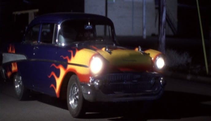 Initially wearing bright red paint, it is revealed to have a royal blue coat with a flame-job underneath this half-way through the climactic race, when some of the Cathedral students power-wash the red off to allow Dylan to evade police identification. Again, we don’t get a good look under the hood, but in dialogue, it is said the car has a “427ci big-block, with a cam, headers, and an elephant carb.”