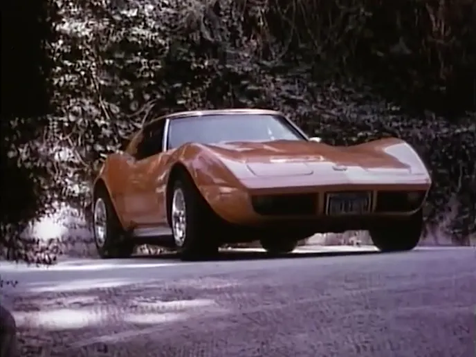 The ‘Vette looks fantastic in code 86 Bright Orange with a black interior, and is an automatic transmission car. Sadly, we never get a look under the hood of either car, but do hear their V8s roar throughout the spectacular pursuit.
