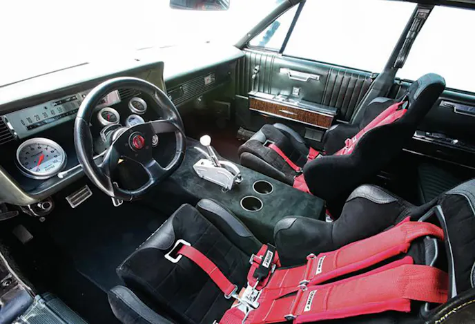 The interior of the car is a mix of original and custom-crafted appointments. Gauges, racing seats with six-point belts, a console, shifter, and steering wheel are amongst the specially crafted bits.