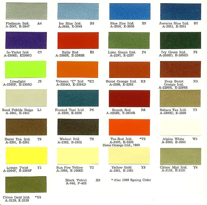 Don definitely wanted the cars to be painted in what Plymouth called a “high-impact” color that he correctly felt was emblematic of the Golden Era of muscle cars. But which one? In 1971, Plymouth’s over-the-top colors included FC7 In Violet purple, FJ5 Lime Light green, EK2 Vitamin-C orange, EV2 Tor-Red orange, FY1 Lemon Twist yellow, FM3 Moulin Rouge pink, FJ6 Sassy Grass green, and GY3 Curious Yellow.