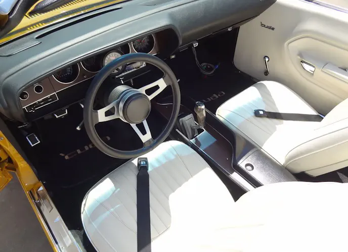 A week later, I returned to the shop to find all three cars finished for the most part, aside from minor trim details. I took a walk around the 340 car and admired its shape, the bold yellow color, the clean-looking white interior, and the Shaker hood with “Hemicuda” on the side. What a beast!