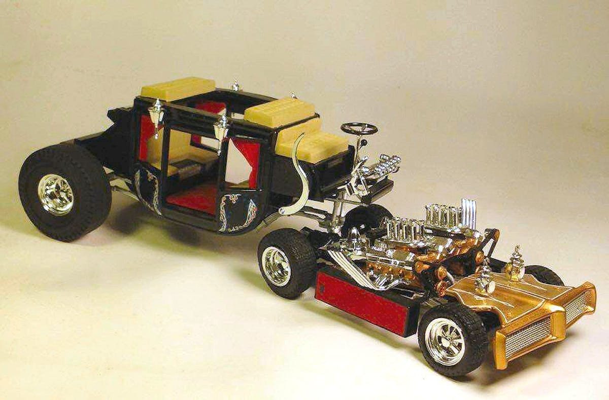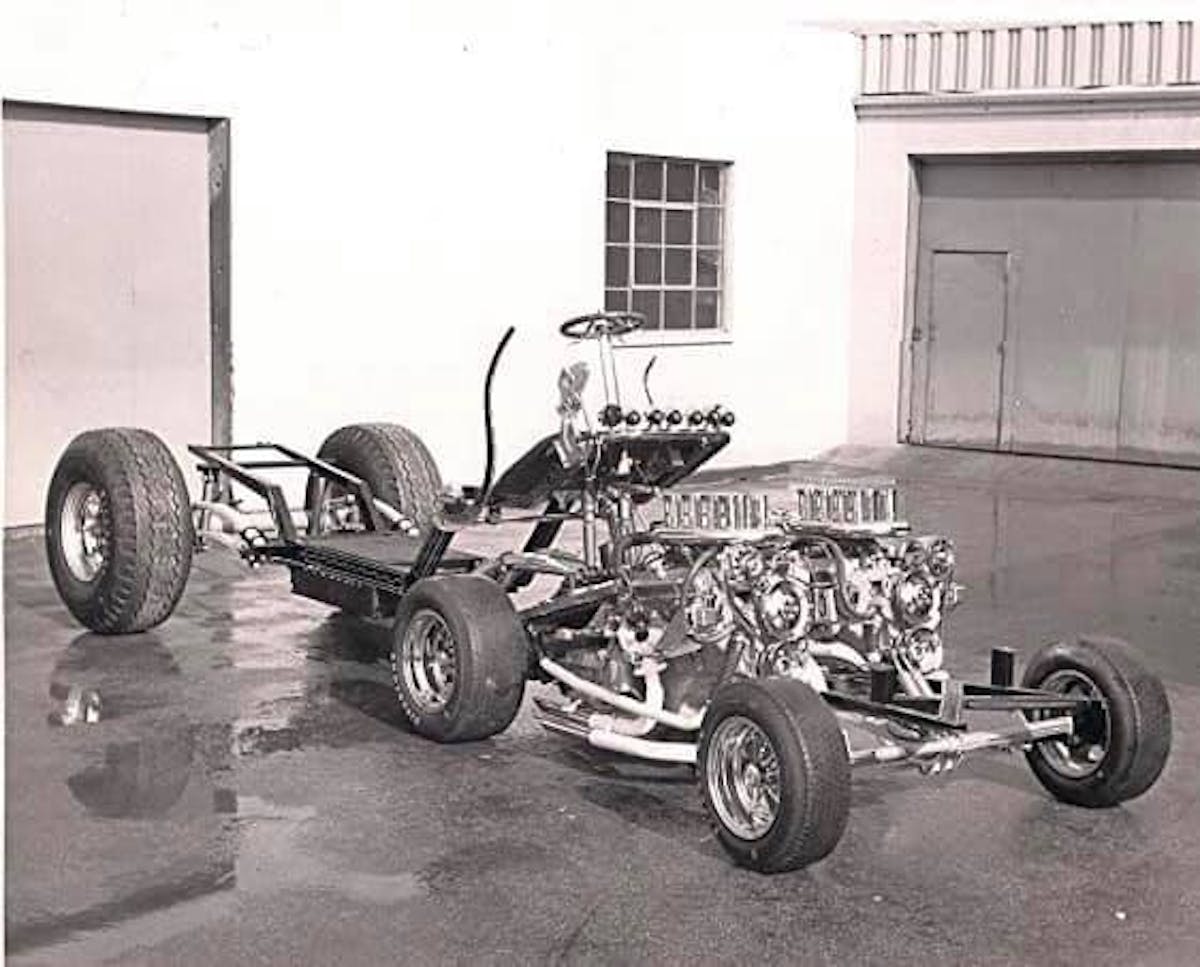 Designed and built in 1968 by the ubiquitous George Barris, it mimicked a hot rod stagecoach pulled by a Goat-faced, separately suspended, articulated team of 428 Pontiac mills replacing its equine equivalent. A keen eye will notice signature-themed Barris tricks like amps and a Vox organ built into the back of the rod.