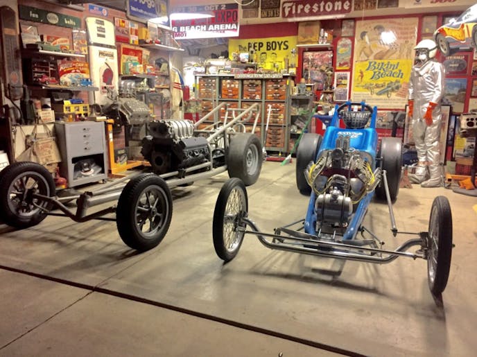 When we went into the garage, I was greeted by not one but two dragsters! One complete and one a project in progress. There was wall-to-wall, petrol memorabilia and carefully curated racing artifacts from a bygone era of automobilia in all its glory. Dimitri recounts the fantastic fateful story of these two dragsters and how he and his Dad acquired them.