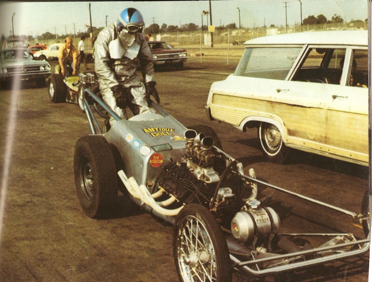 Passing through different hands, and ending up with a flathead engine, the Scrima-Adams-Smith dragster was renamed the “Antique Doll,” because no one could understand why anyone would continue to race an outdated short wheelbase rail with a flathead when cars of the day had longer chassis’ and blown Hemis.