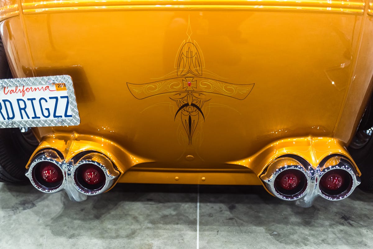 The second version was fit with a new grille insert fabricated from square tubing as well. A gold R was placed in the center of the new grille insert. Inside, new custom made seats were installed along with a cut down early 1960s Ford steering wheel and the car received a gloss Tequila Gold paint job and pin striping by Makoto. The wide white wall tires and chromed steelies were replaced by Cragar Star Wire Wheels that ran 1960s style white stripe tires.