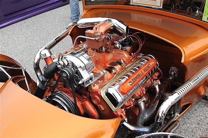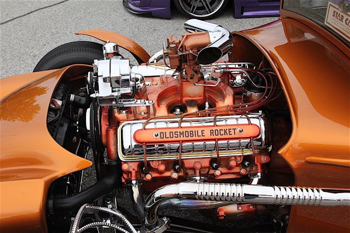The firewall and engine cowl had to be massively reworked to fit the lowered stance and massive Olds engine. Using a 1959 Cadillac front bumper ends as a base, he added round tubing and sheet metal to create a completely new nose for the car – complete with canted quad headlights.