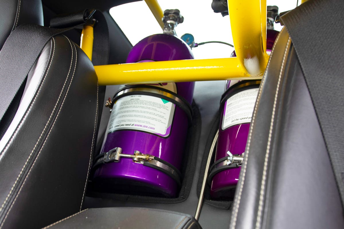 Another attention grabber is the twin nitrous bottles mounted in the trunk area that are an active horsepower adder as well. “Before the supercharger, I had a nitrous system on top of the engine,” Meeks adds. “I didn’t want to lose that, so I plumbed some nitrous injectors into the manifold assembly.”