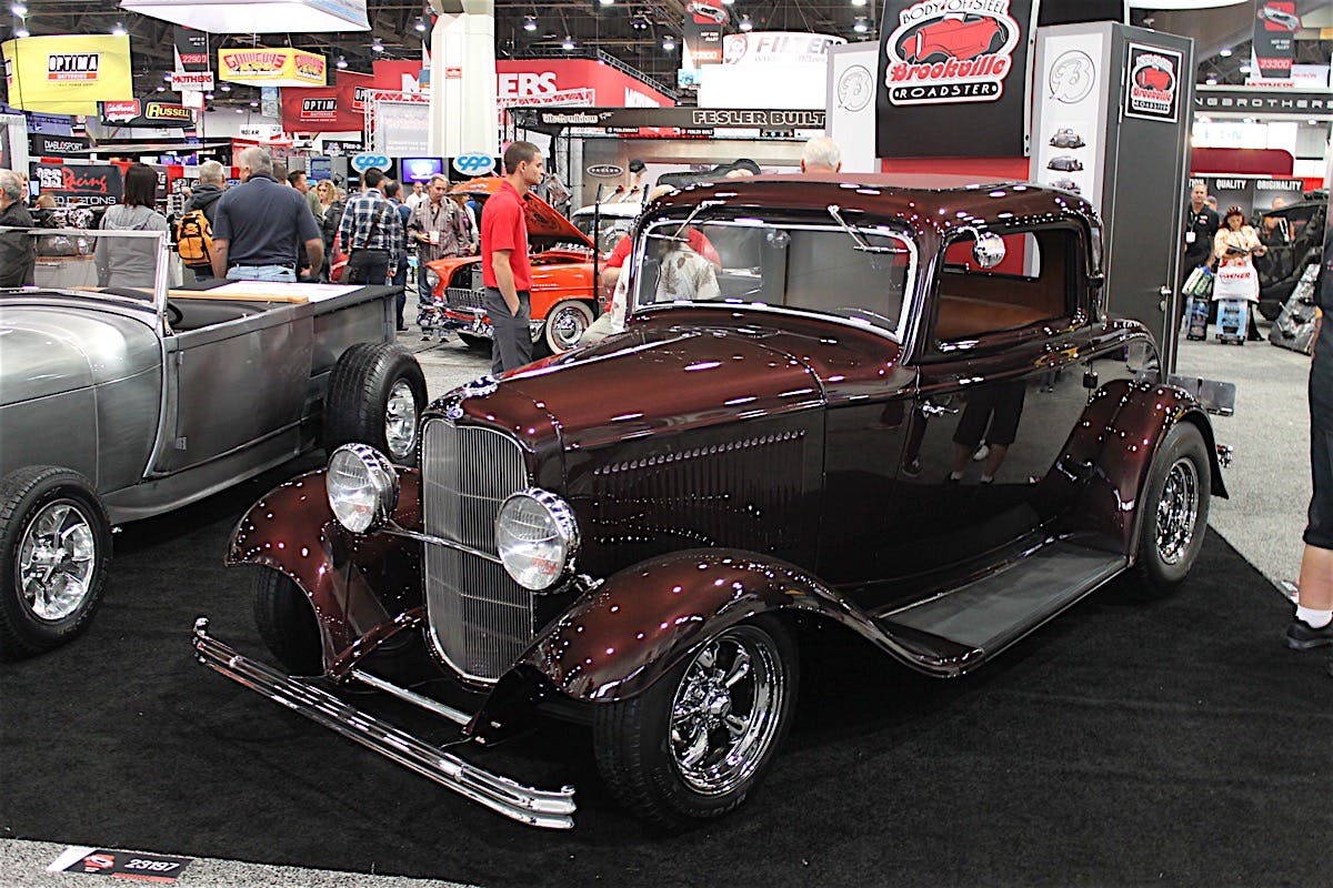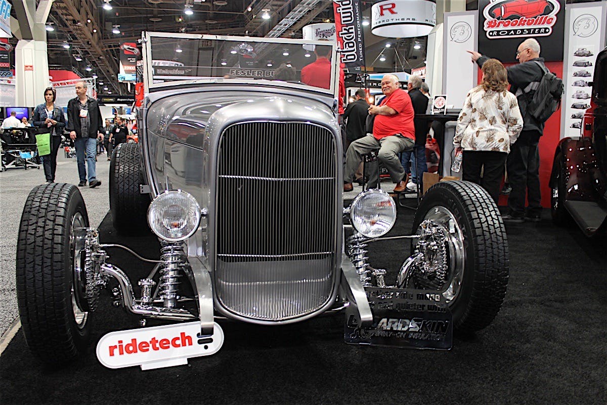 As proof of their skill, two impeccable show cars decorated the booth — a three-window ’32 Ford and a custom roadster pickup. Raymond said the Ford was built from the ground up as a customer project. It had all brand-new steel, a small-block Chevy with a 9-inch Ford rearend, all chrome underbody, and all leather interior.