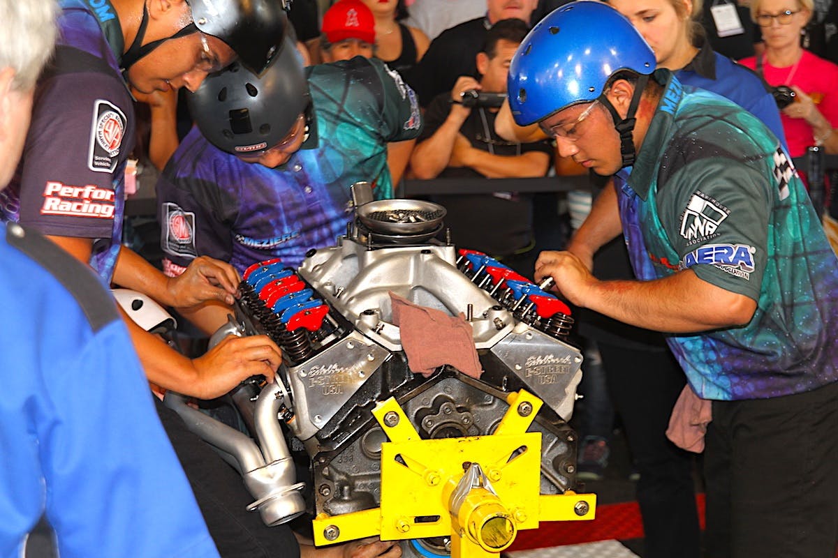 The contest was the brainchild of Vic Edelbrock and has been executed by Hot Rodders of Tomorrow President, Rodney Bingham, and his team of dedicated volunteers. High school “shop class” students qualify through several tiers of competition, using only hand tools, to do a complete (to the bare block) teardown and proper reassembly.