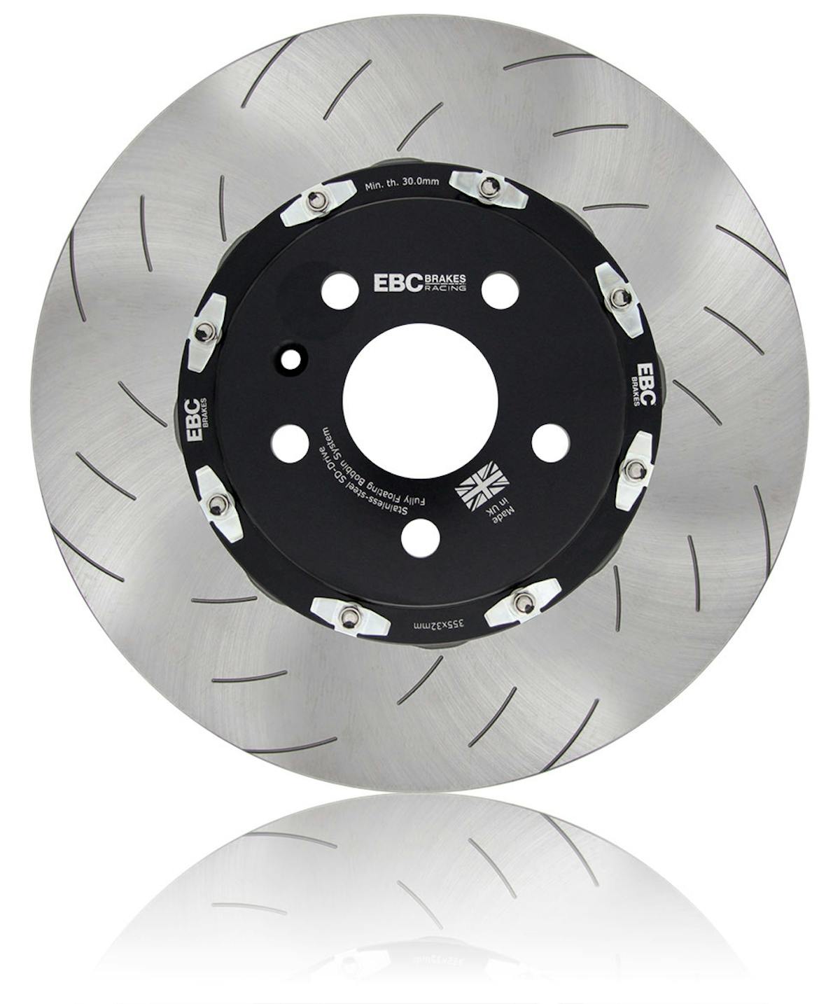 The EBC two-piece rotors are available in three forms: 1)- SG2F rotors that serve as a direct replacement for performance vehicles where 2-piece brake rotors are fitted as standard, like the R35 Nissan GT-R. 2)- The SG2FC two-piece floating rotor conversions that upgrade OEM one-piece cast iron rotors to performance two-piece floating alternatives, such as the Honda Civic Type R. All SG2FC conversions easily replace the OEM one-piece rotor and are designed to integrate with the OE caliper and pads with no vehicle modifications necessary. 3)- The SG2FK rotors that are included in EBC Brakes Racing’s Balanced Brake Kits.
