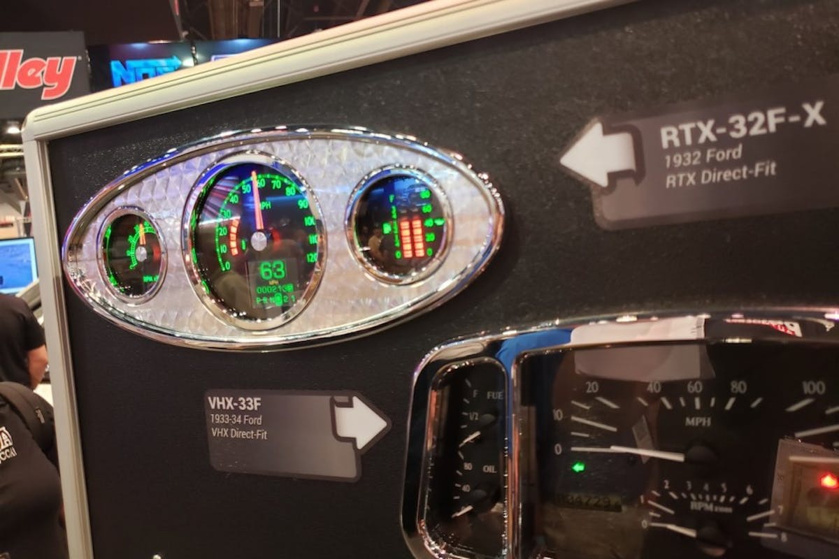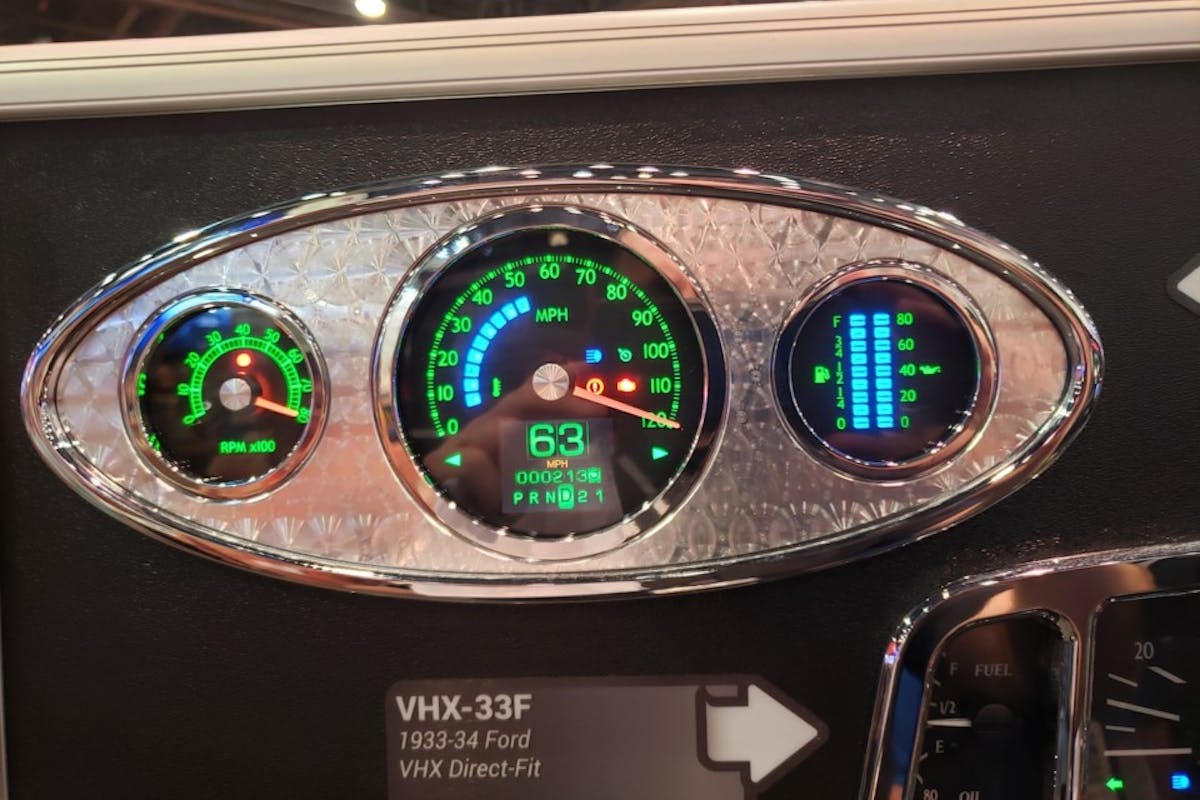 The RTX-32F-X 1932 Ford system includes analog speedometer, and fuel level gauges. Digital bar graph gauges for the tachometer, oil pressure and water temperature with a voltmeter shown in the digital message center.