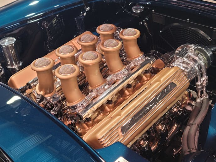 Doug’s Performance Corvette (formerly Classic Reflection Coachworks) makes the carbon-fiber body and ships it to Kindig Design in Utah. From there, it is plopped onto a state-of-the-art Roadster Shop chassis, complete with modern suspension and brakes. Then the Kindig guys stuff in a GM LS crate motor, all suited up in stacked, gilded glory.