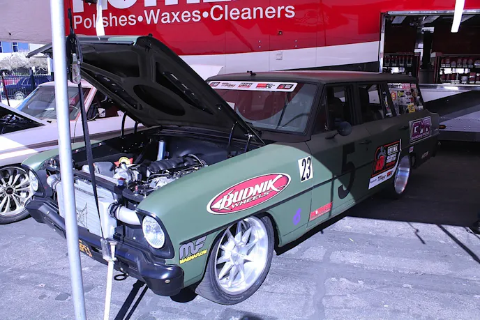 With a full cage, racing seats, and a satin olive-green wrap, the 1966 Chevy II wagon was just about ready. The front end was about 70 pounds lighter, thanks to the Total Cost Involved front clip, and Skrape was ready to hit the track with his Nova. A few adjustments here and there, and the boosted LS was putting about 540 horses to the rear wheels, and ready for action.