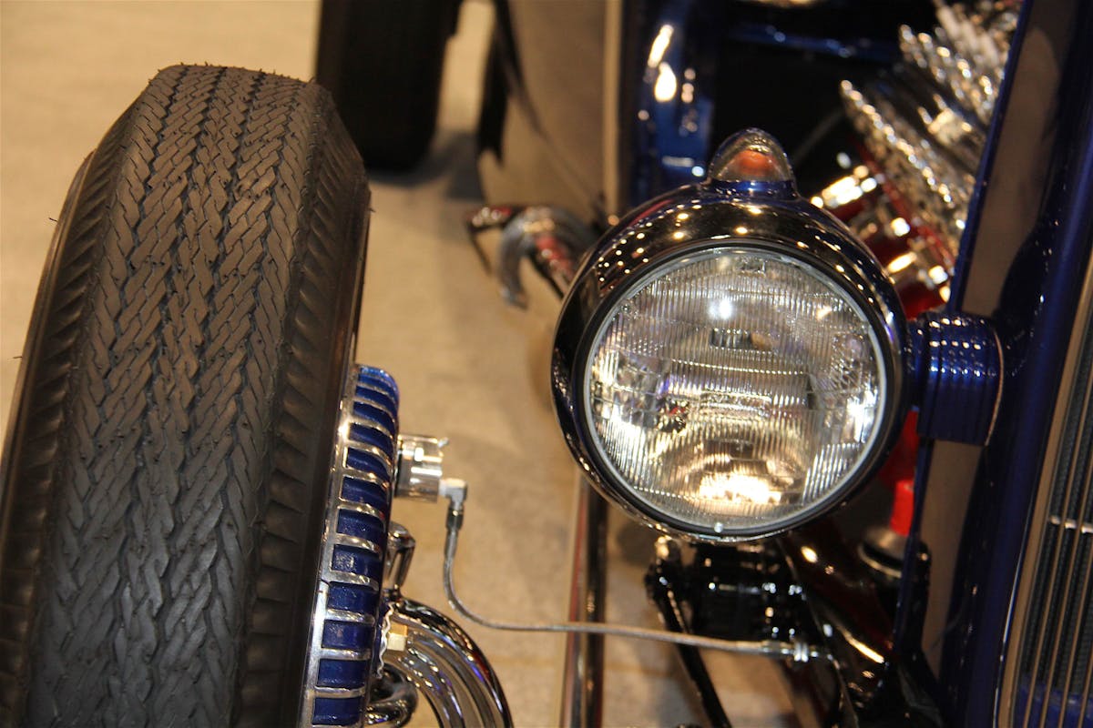 The goal was to make it appear to be stock at the same time create the necessary space. Other tricks included removing the stock fuel tank to make room for the cowl steering, handmade trunk hinges and even a slight chop for appearance. The rear tail lights are one of two sets that Reisingers created. The other set is on Pats model A roadster. The headlights are from a 1934 White firetruck attached to the ’32 grill shell with modified headlight brackets that also came from the White.