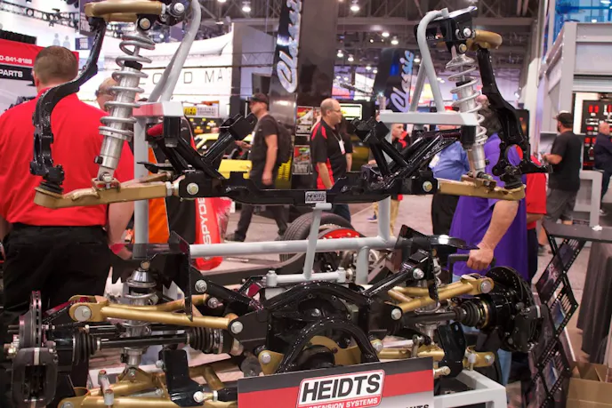 Brett Kinsfather, director of sales at Heidts Suspension Systems, reeled us into the Heidts booth with the great looking Tri-Five complete chassis that was acting as the centerpiece of the display. A piece like this one was the foundation for the Tri-Five Nationals giveaway car. “This is a GM-certified re-pop frame from Woody’s Hot Rodz that features our complete front and rear independent suspension,” said Kinsfather.