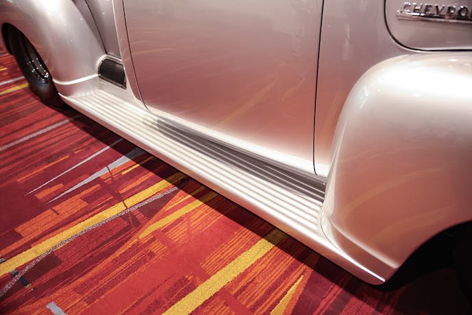 The bed of the truck is all removeable so Tim can service the truck as needed. Each of the rear fenders were chopped and stretched down to really make it look like the tires are tucked under the rear of the truck. The wheel arches were brought down to the running boards, which have also been widened, as well. All of the seams have been removed from the fenders, and any bolt that could be shaved off on the outside of the truck was removed to add to the sleek look.
