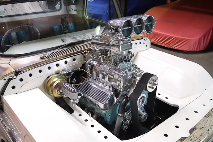 If where the steering wheel sits doesn’t grab your attention, the supercharged big-block Chevy will. The engine is wearing a Weiand supercharger and a pair of Edelbrock carbs that feed the mill its air and fuel. This really amps up the look of the engine bay, but it’s still tame enough for plenty of street driving.
