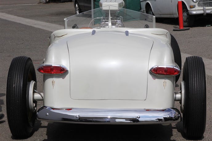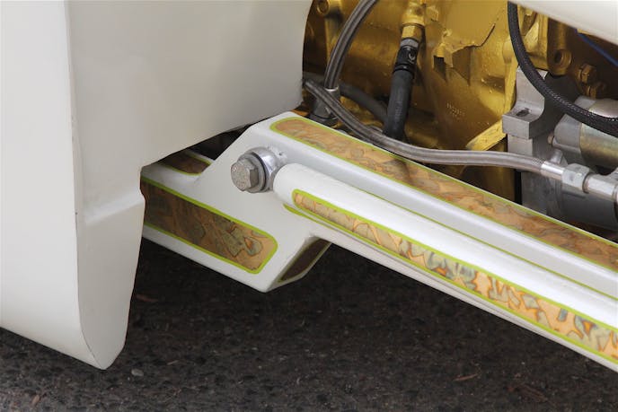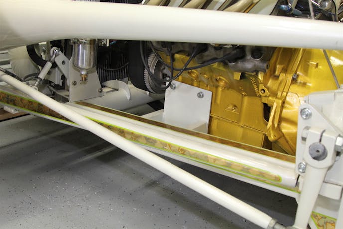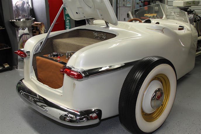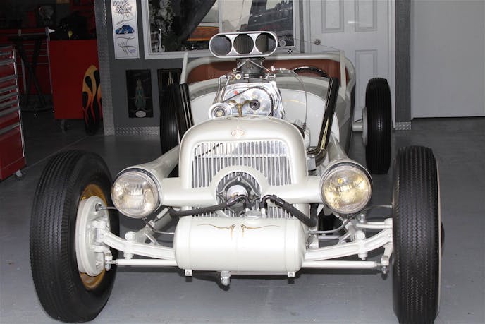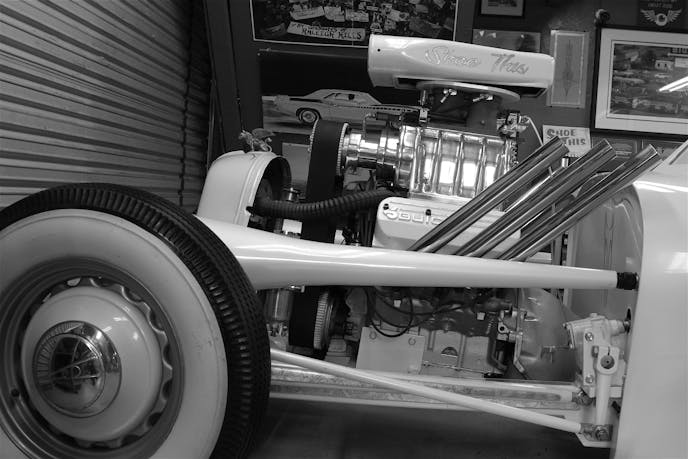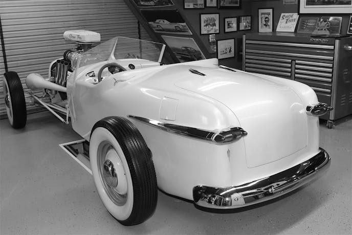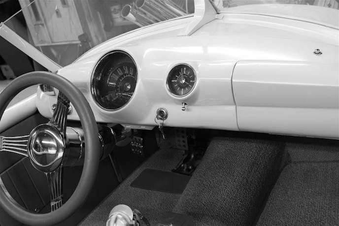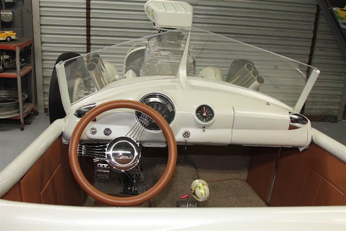 One of the best features in the bodywork is the careful manipulation of the 1951’s Ford dash into the T-bucket’s cowl and bodywork. It looks like it was made that way from the factory, and a casual observer wouldn’t know any different. The body is finished in a PPG White Platinum Pearl, which has to be viewed in the right light to get the total essence of the color choice.