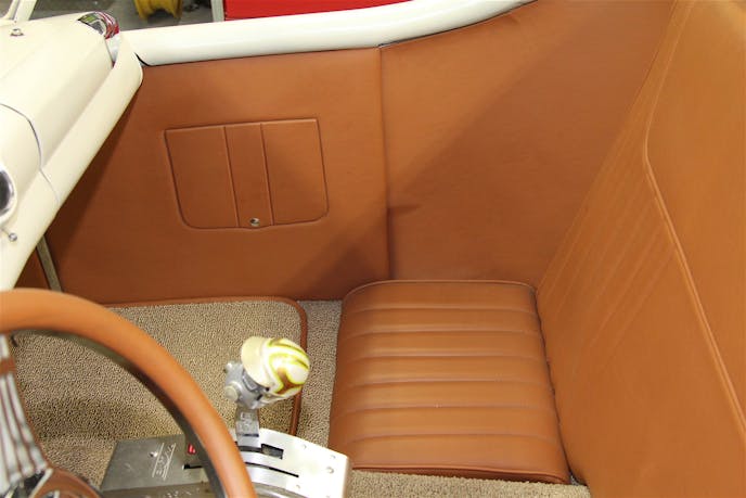 The windshield is custom glass and frame, raked to make the overall stance and appearance look like it came out of the ’50s heading to the dry lakes. The interior sports two bucket seats and full panels and trim by Old Town Upholstery.