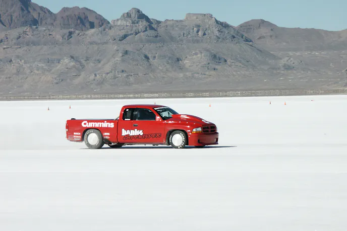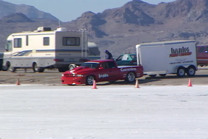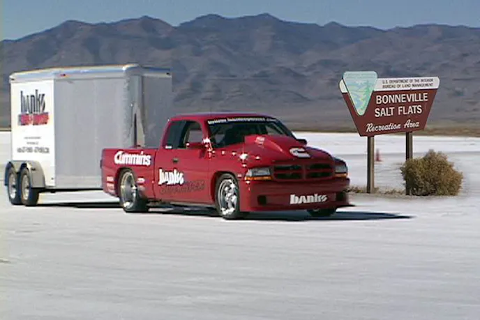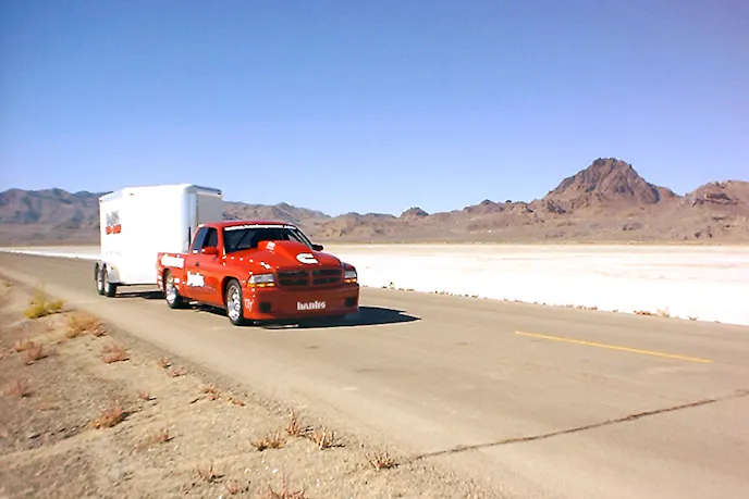The trailer behind the Sidewinder Dakota carried the wheels and tires that would be swapped onto the truck, as well as a workbench and tools. Then that same truck hit the salt flats at Bonneville and set the record for the World’s Fastest Pickup with a two-way average of 217 mph, with a one-way top speed of 222 mph.