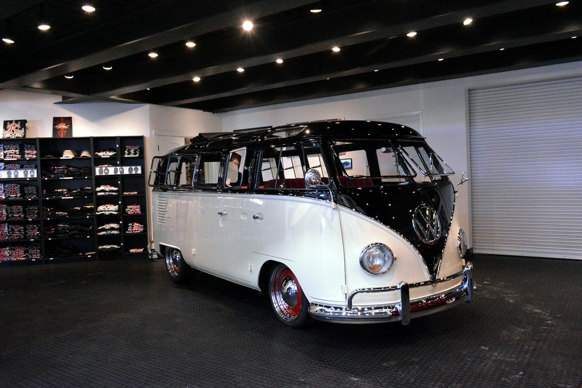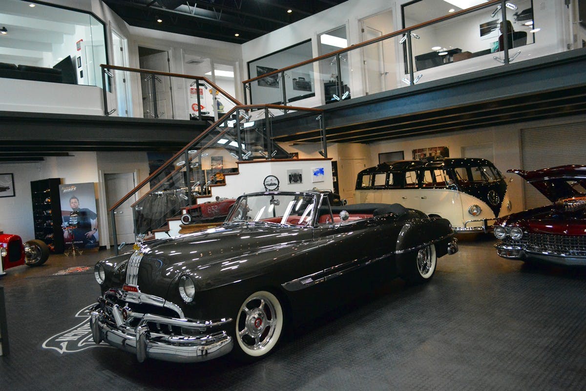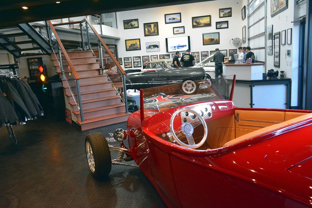Just this past year, Kindig-It Design fully renovated the shop’s showroom. What once was an oversized garage bay with offices and Dave’s drawing room tucked away off to the side, was opened up to a top-notch modern masterpiece with more floor space for completed builds and the company’s apparel line on ground the level, and roomy offices with floor-to-ceiling windows overlooking the showroom floor on the upper level.