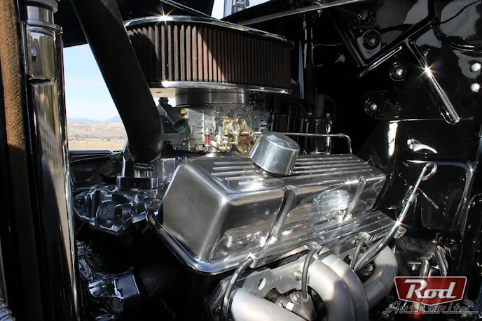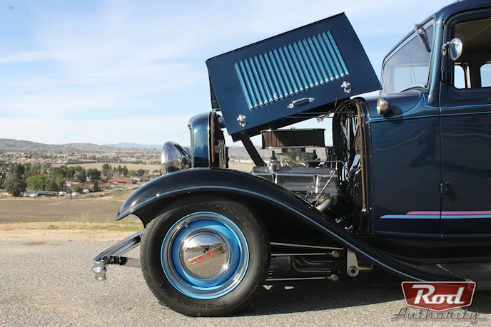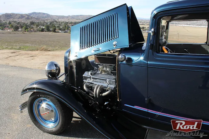 Moving on to his gorgeous ride that we had the pleasure of shooting in the foothills of Moreno Valley–in the rear you’ll find an old Pete and Jake four-link suspending a rearend out of a ’66 Ranchero. The rearend runs 3.55 and was shortened to take two short axles. John wanted to offset the rails so that he could run bigger tires out back. A coilover setup rounds out the rear of his ’32.