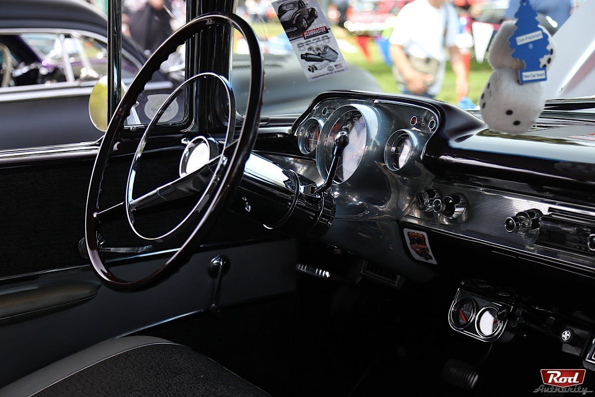 The two-tone black and silver interior complements the black cherry paint exquisitely, resulting in a classy, simple look that isn’t too loud or too dull. King added a tachometer near the steering column as well as oil pressure gauges to keep everything in check as he drives the Bel Air.