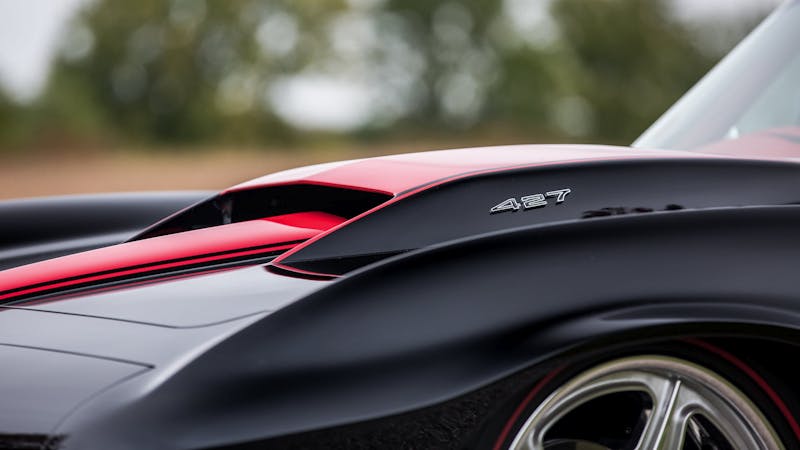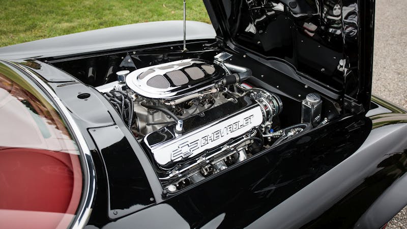 Perhaps a favorite aesthetic of the car is the sinister black paintjob with red stinger-scoop that give this Corvette a classic look and feel. The paint is complemented by a Lipstick Red leather interior by Steve Holcomb. Interior upgrades include Vintage Air and Classic Instruments gauges in the dash.