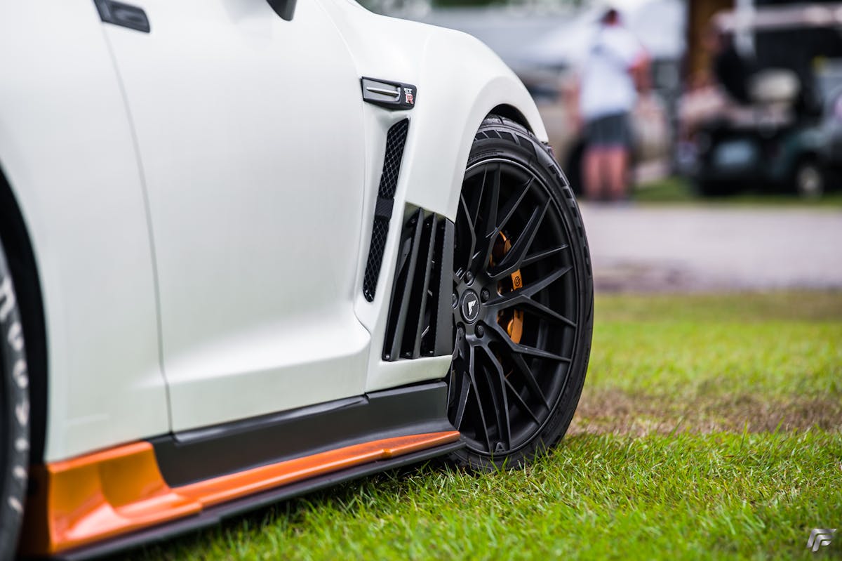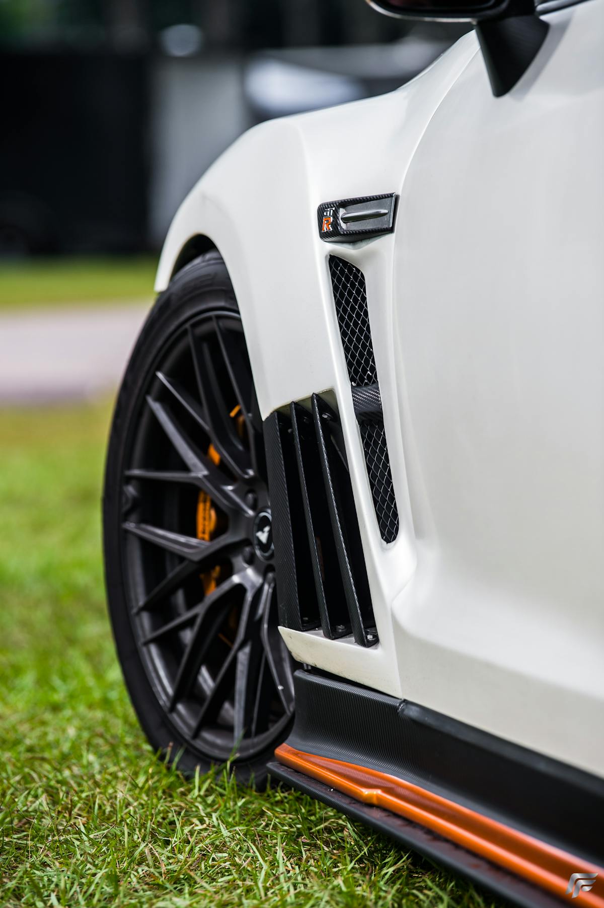 Moving to the side, the Varis front fenders have always been a favorite of mine. Not stopping there with the carbon, Battista has installed a set of carbon fiber doors hidden under the wrap. The Kuhl side skirts show hints of the Nismo styling, but Battista has gone an extra step further and has added carbon plates underneath.