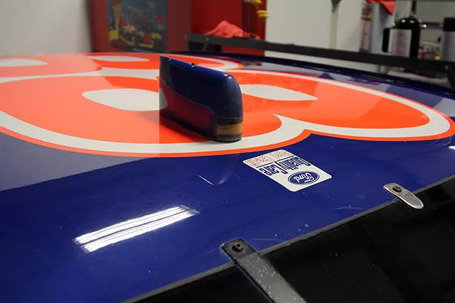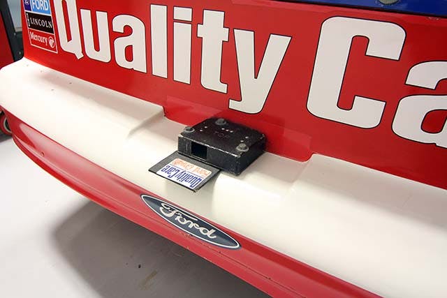 The Thunderbird is still in the same condition it was in when it rolled into Daytona’s Victory Lane over 20 years ago. Notice how sand and grit thrown up off the track from other cars has sandblasted the red off the lower valence. We also wonder what did the damage in the bumper cover.