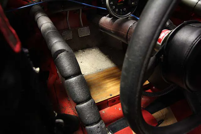 This photo may be a little bit hard to discern at first, but this shot is of the driver’s footwell. In these cars the left-side header runs directly underneath the driver’s feet and during a race the floorboards can get incredibly hot. To protect the driver’s feet teams needed a highly efficient insulator that is also quite stiff so that it won’t affect the driver’s “feel” through the pedals. The answer at the time was a sheet of good-old-fashioned plywood.