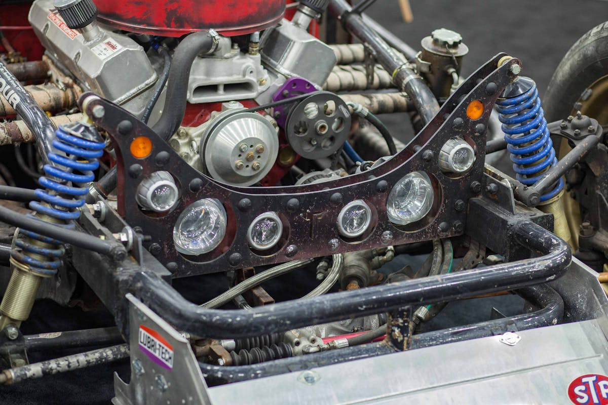 Project Tarantula gets its name from the way the Hella lights resemble a Spider’s eyes when positioned in the Ozan Chassis Shop-designed front crossmember. Afco circle track coils hang off that crossmember, paired with RideTech coils in the rear to keep the car well planted at all times.