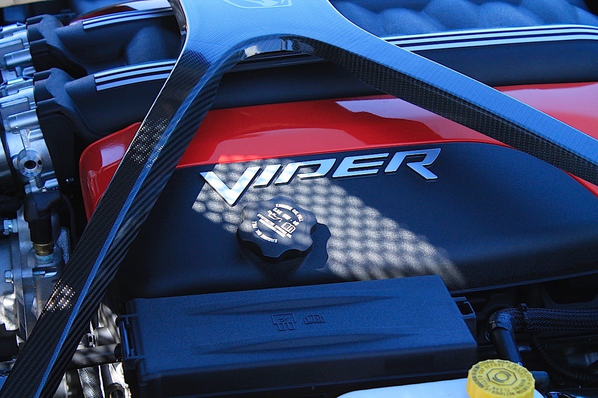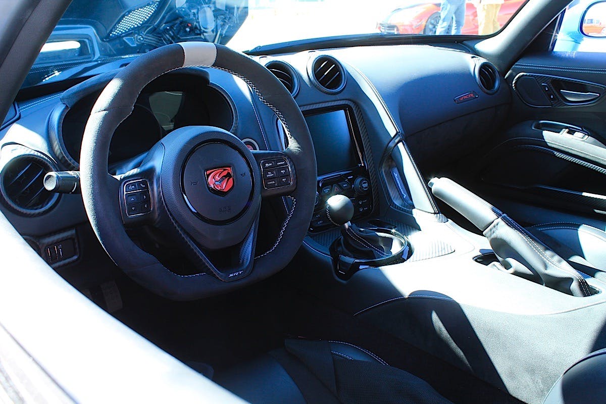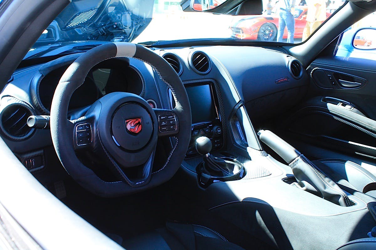 Compared to a standard Viper, the ACR boasts nearly one ton of downforce at 177 miles per hour because of its aggressive aero package, 1.5 g of sustainable lateral grip in the corners due its ten-way adjustable Bilstein coilover suspension and Kumho Ecsta V720 high performance tires (made specifically for this car), and some very serious stopping power by way of a new Brembo “Carbon Ceramic Matrix” system, which utilizes 15.4-inch two-piece front rotors (with six piston calipers) and 14.2-inch discs out back that are clamped by four-piston calipers.