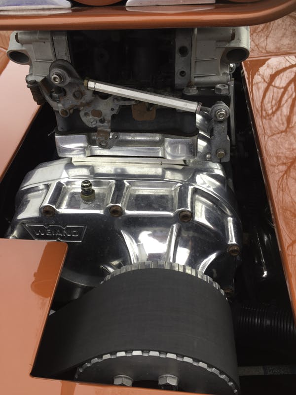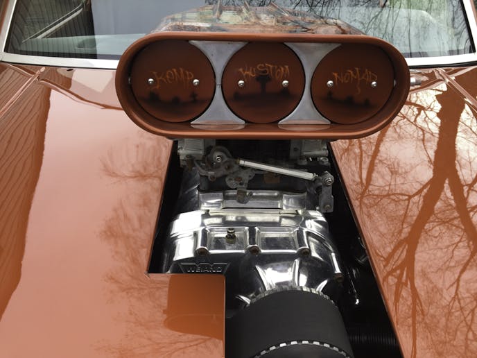 They added a 383 cubic-inch stroker motor, 671 Weiand street blower, two Holley 750cfm double-pumpers, and an under-driven turbo-400 manual transmission. They also added a 9-inch Ford rearend with 3.50:1 gearing and 35-spline axels. It also features drag radials on the back and it mini-tubbed with 7-inches added.