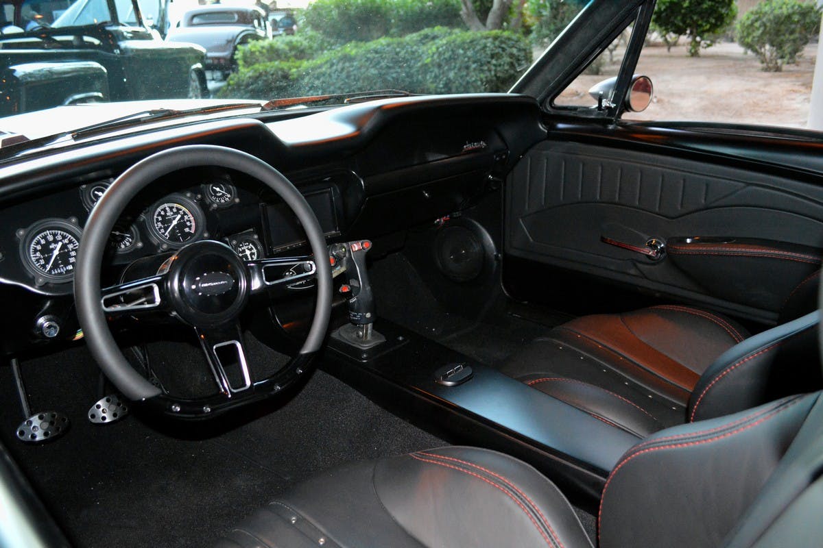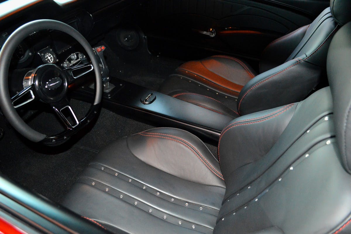 Designed by Steve Holcomb’s Pro Auto Custom Interiors, the Mustang’s interior features custom bucket seats in the front with red stitching and custom rivet details, matching door panels, and a custom wrap-around dash pad.