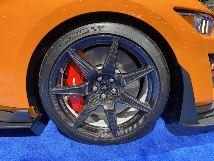 The orange Shelby was equipped with the $18,500 Carbon Fiber Track Pack. The upgrades include a rear seat-delete, Recaro racing seats, a carbon-fiber instrument panel, adjustable-strut top mounts, a massive carbon-fiber rear wing, and most apparent, Michelin Pilot Cup Sport 2 tires wrapped around 20-inch carbon-fiber wheels.